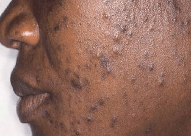 Acne is a common skin condition where the hair follicles are clogged with oil and dead skin cells. It causes black heads, white heads and pimples to appear on face, chest, forehead and shoulders.